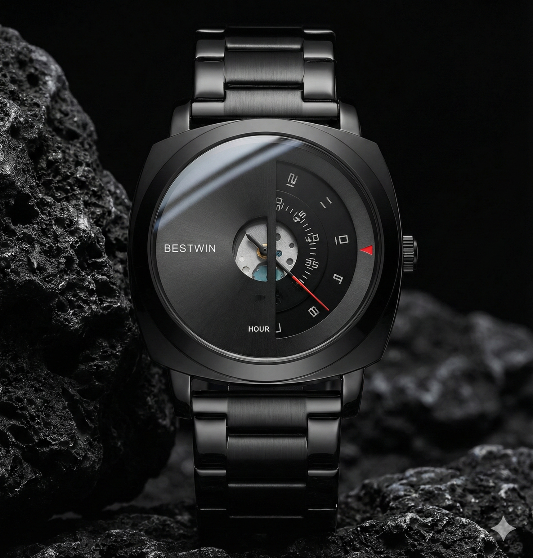Designed with a bold gold-tone case and a curved open-window dial, this men’s watch delivers an architectural look that sets it apart from traditional designs. The layered face layout and brushed metal detailing pair with a solid link bracelet to create a statement piece built for everyday wear.